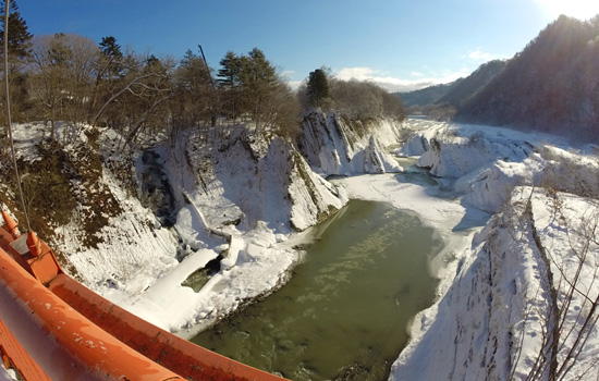 離陸場所は 橋の上か適当平地スペースから。雪上の場合は離陸スポット持参のこと。